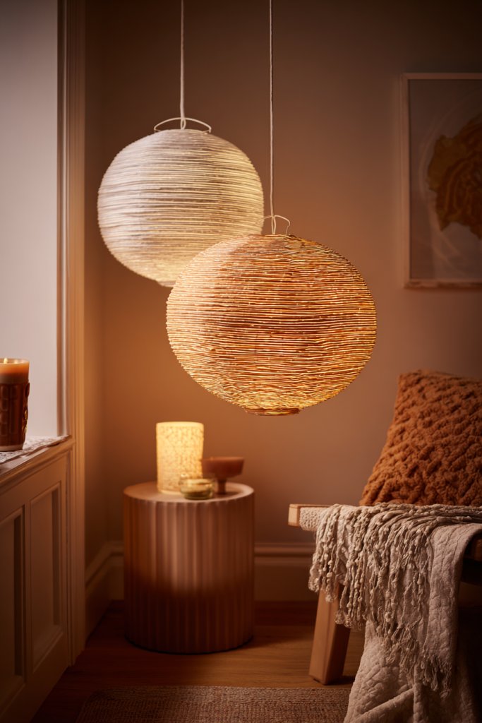 Imagine a series of lanterns crafted from natural materials like rattan, paper, or wire, hanging in a cluster. The glow filters through textured surfaces, casting soft shadows that dance across the walls. The lanterns’ shapes are organic and imperfect, adding to the relaxed, bohemian vibe. The room feels intimate and warm, perfect for relaxing or entertaining.