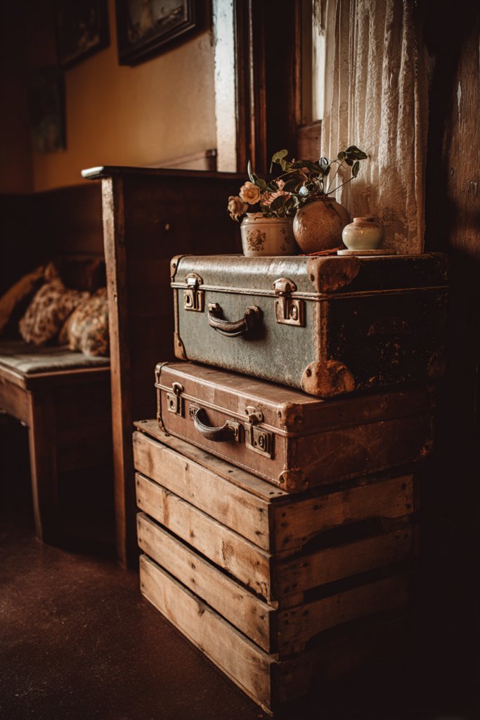 Picture an open vintage suitcase used as a side table, filled with blankets or magazines. A weathered crate stacked with other crates becomes a multi-level storage unit, with decorative touches like fabric lining or paint. The distressed finishes and rustic hardware add charm, making storage look intentional and stylish rather than messy. The overall look is nostalgic, eclectic, and full of personality.
