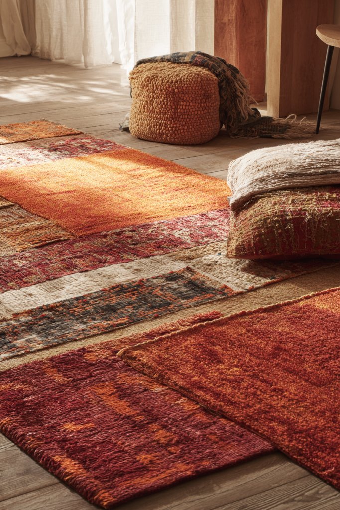Imagine a layered arrangement of rugs—one large, neutral base with smaller, vibrant rugs on top. Textures range from shaggy to flatweave, creating a tactile mosaic underfoot. Bright colors and bold patterns contrast with muted tones, making the space feel lively yet balanced. The combination of textures and hues creates a cozy, inviting atmosphere that invites you to kick off your shoes and relax.