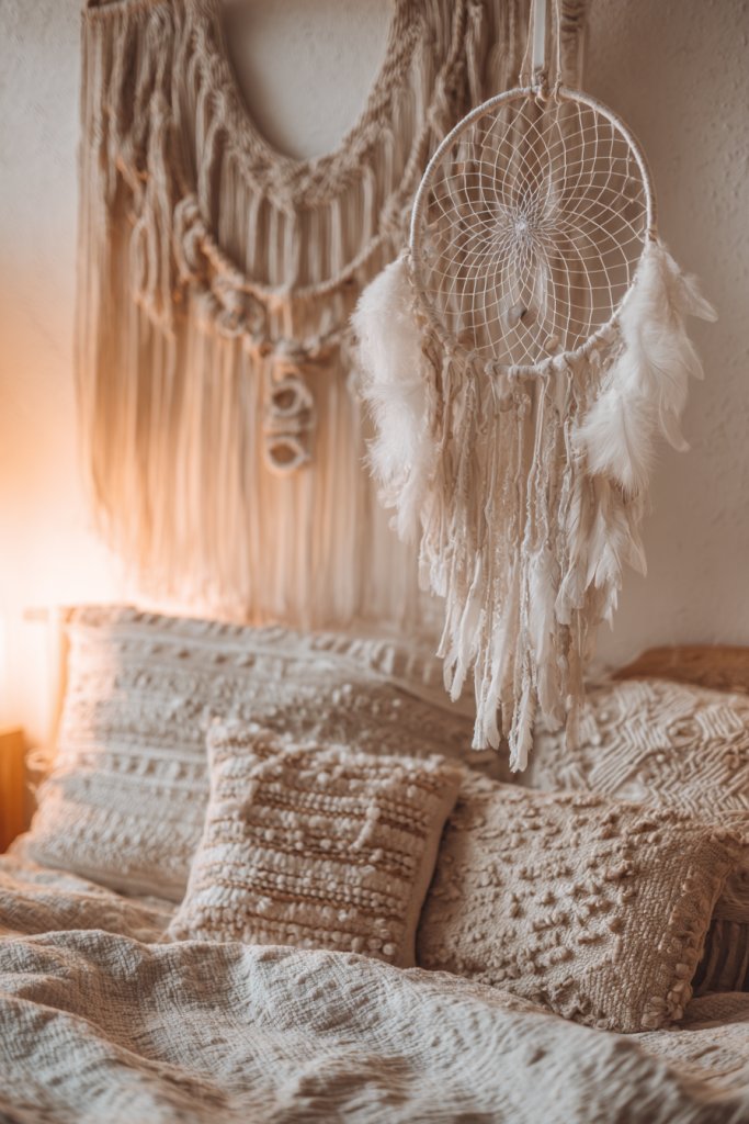 Visualize a wall decorated with a large, intricate dreamcatcher adorned with feathers, beads, and embroidery. Surround it with smaller textile pieces—woven wall hangings, embroidered patches, or fabric banners. The textures vary from soft and fluffy to tightly woven, creating visual depth. The overall effect is enchanting and peaceful, making your space feel like a personal sanctuary.