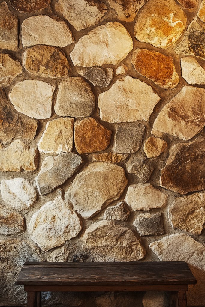 Picture a wall combining rough-hewn natural stone with reclaimed wood panels or beams. The stones’ earthy tones—browns, tans, and grays—contrast beautifully with the warm hues of aged wood. The juxtaposition creates a layered, textured surface that’s rich and tactile. The combination invites both visual and physical exploration, making the space feel layered and thoughtfully curated.