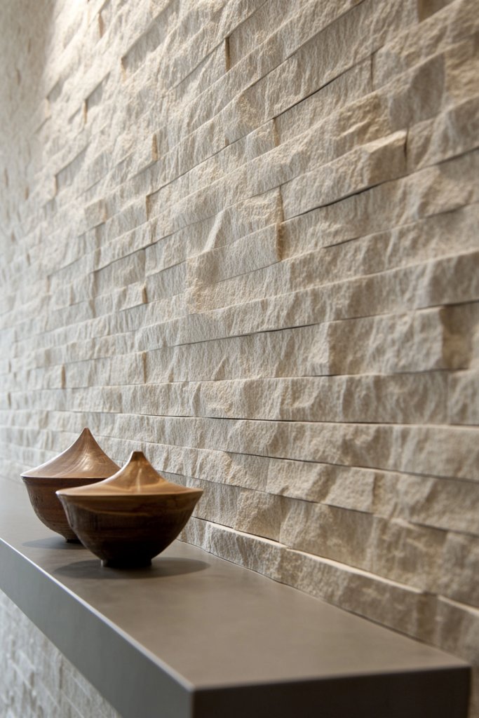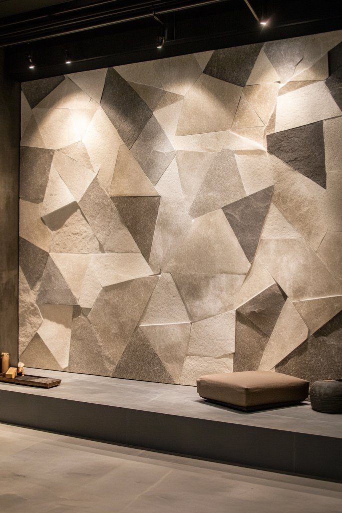 Enhance with integrated lighting or backlit panels to emphasize the geometric pattern. Incorporate metallic or glossy finishes on some stones for a luxe effect. Use minimalist furniture and decor to let the wall be the star. Add seasonal accents like colorful textiles or art pieces for variety.