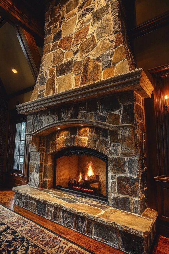 This approach suits traditional, rustic, or modern interiors. Pair with sleek mantelpieces, minimalist furniture, or vintage accessories depending on your style. In colder seasons, add cozy throws or layered textiles nearby. Use warm lighting to accentuate the stone’s natural hues and textures for maximum impact.