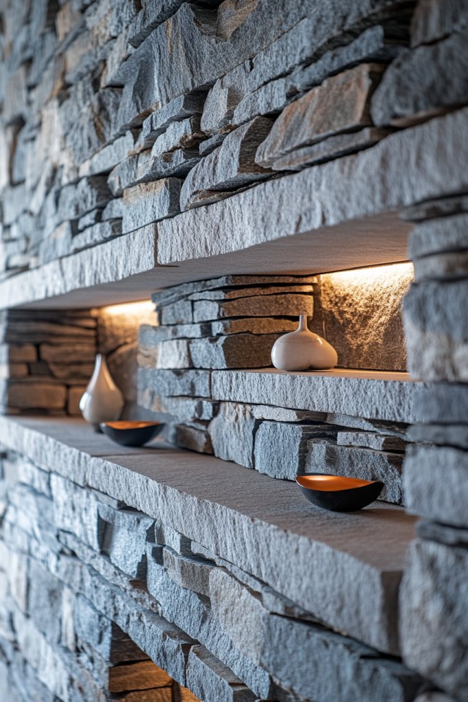 A stone wall with built-in shelving or niches combines practicality with aesthetic appeal. It transforms a plain surface into a curated display that reflects your personality. This feature adds depth and sophistication to any room, making your home both beautiful and functional. Trust in your design instincts—this is your canvas to create something truly special.