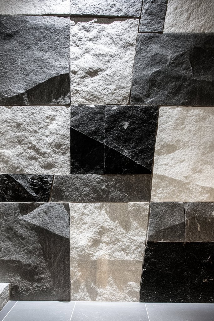Imagine stones in varying shades—deep blacks, vibrant reds, icy whites—arranged in geometric blocks or abstract patterns. The stark contrasts highlight each section, creating a dynamic, layered effect. The textured surfaces catch the light differently, emphasizing the color variations and adding depth. It’s like an abstract artwork you can touch.