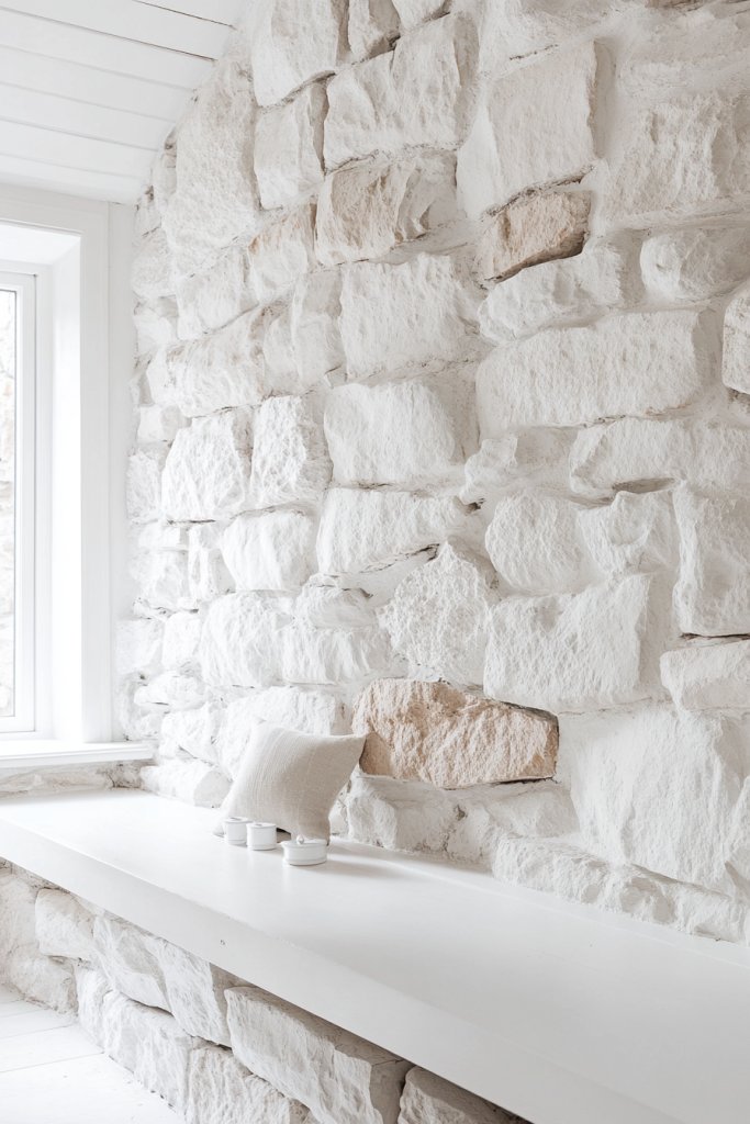 Picture stones coated with a thin layer of matte white paint, allowing the natural texture to peek through. The effect is a subtle, luminous surface that reflects light rather than absorbs it. The irregular edges and crevices create delicate shadows, adding depth without heaviness. This approach transforms rough stone into a delicate, sophisticated backdrop that pairs well with soft textiles and light wood accents.