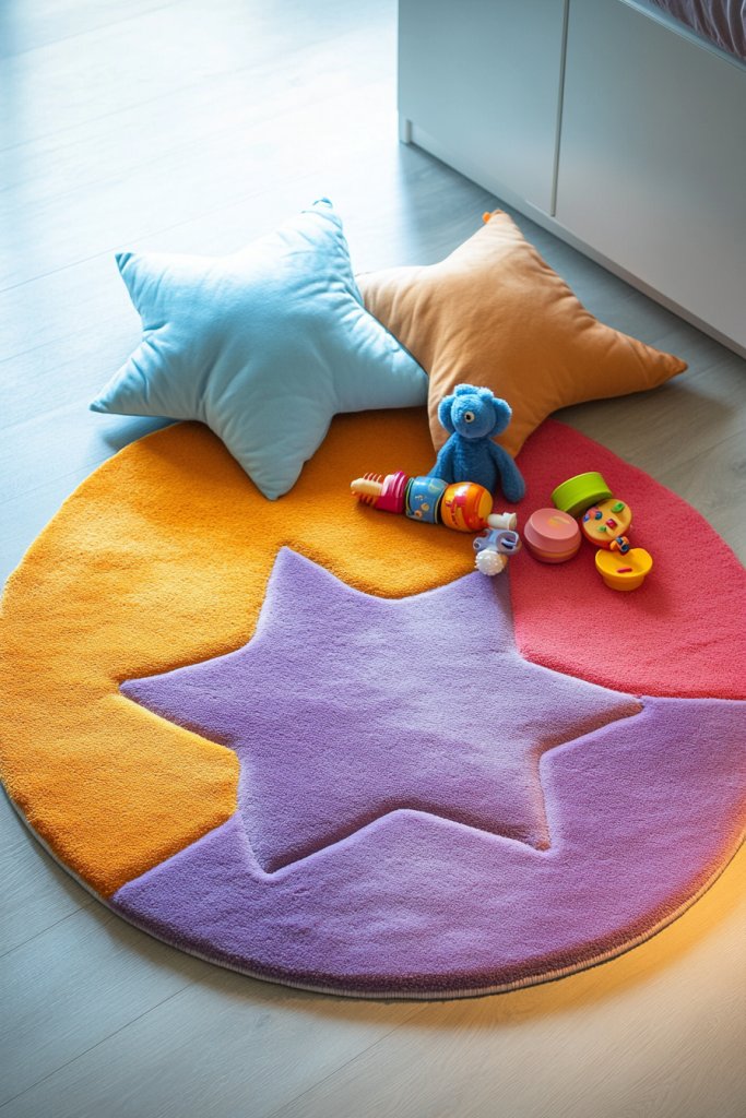 Picture a bright, plush rug in the shape of a cloud, star, or animal, placed centrally in the room. The soft textures invite kids to crawl, sit, or lie down comfortably. The colors are vibrant but coordinated with the room’s theme, adding a playful touch. Surrounding the rug are cushions and toys, making it an instant retreat for reading, playing, or relaxing.