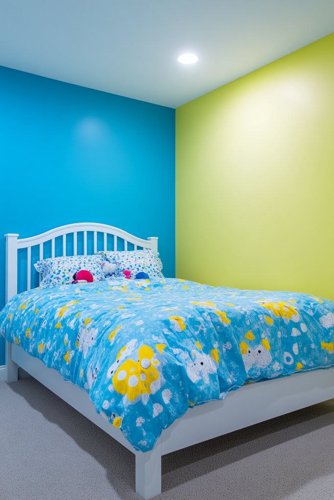 Imagine a room painted in a cheerful pastel or vibrant hue, with one wall serving as an accent in a contrasting shade. The finish is semi-matte or satin, which hides imperfections but is still easy to wipe clean. Kids’ artwork can be displayed on the accent wall, adding personality without damaging the paint. The overall look is bright, inviting, and built to withstand daily adventures.