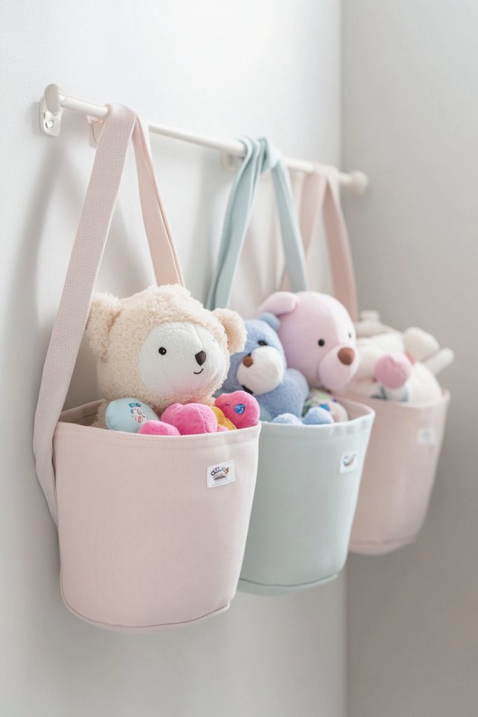 Imagine fabric baskets hanging from hooks or a rod behind a door, filled with cuddly stuffed animals and plush toys. The baskets are in playful patterns—polka dots, stripes, or themed prints—that add a pop of color. The toys spill over slightly, creating a cozy, inviting look. The soft fabric complements textiles in the room, making the space feel warm and welcoming.