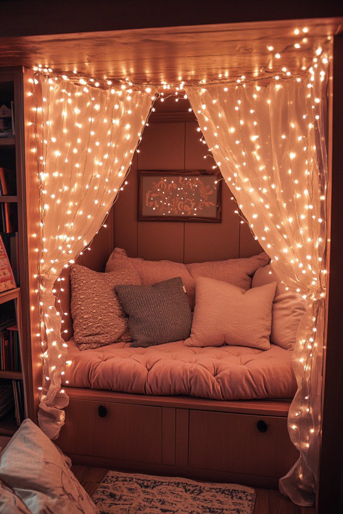 4. Cozy Reading Nooks with Cushions and String Lights