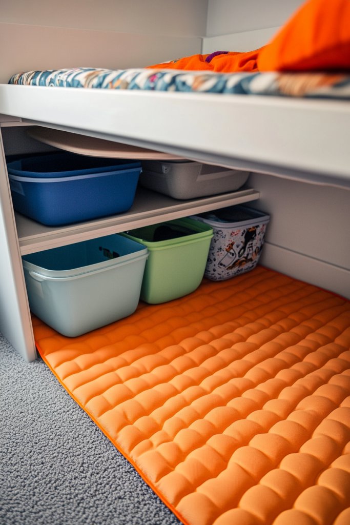 Envision a compact nook beneath a child’s desk, filled with a colorful cushioned mat. Small storage bins hold art supplies, building blocks, or figurines, all within arm’s reach. The space feels like a secret hideaway, with a cheerful vibe created by playful patterns on the mats and containers. When kids sit or kneel here, it’s a cozy, inviting zone for hours of fun.
