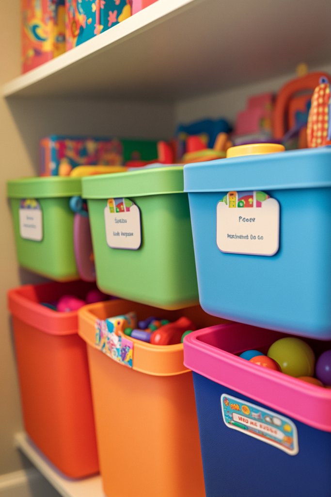 Picture colorful storage bins with themed stickers—dinosaurs, princesses, or superheroes—on each container. Clear labeling helps children identify where toys go, making clean-up quick and simple. The bins are arranged neatly on shelves or in cubbies, creating a cheerful, organized display. Kids feel proud when they see their room look tidy, almost like a mini toy store.