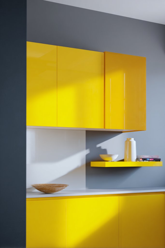 Imagine a yellow backsplash or accents contrasted with sleek gray cabinetry. The vibrant yellow adds warmth and cheer, while the cool gray tones ground the look. Matte finishes on gray keep it sophisticated, and glossy yellow elements add a playful touch. Bright lighting enhances the lively atmosphere, making the space feel open and inviting.