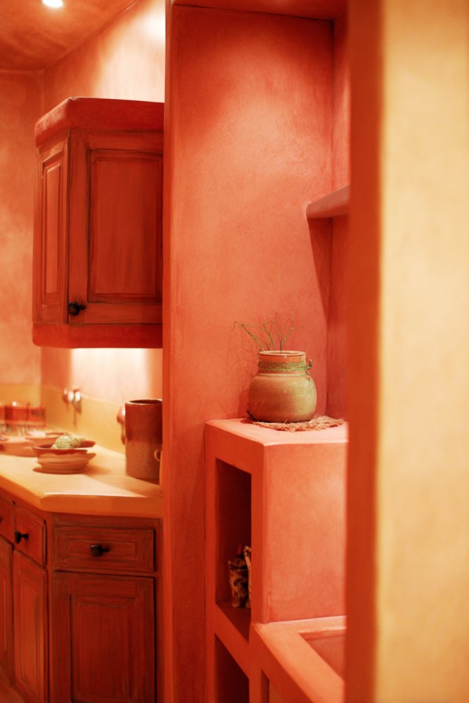 Use terracotta tiles or paint on walls or floors to set the tone. Combine with cream or off-white cabinetry—matte or distressed finishes work well. Incorporate natural wood or wrought iron fixtures. Use warm lighting—think amber or yellow hues—to enhance the earthy warmth. Keep the space uncluttered, emphasizing textures and natural beauty.