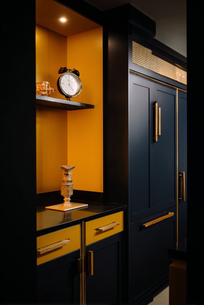 This look brings a playful yet elegant vibe, making your kitchen memorable. It’s perfect for vintage lovers or anyone wanting a space that sparks joy. With navy and mustard, your kitchen becomes a lively, nostalgic sanctuary that feels both timeless and fresh.
