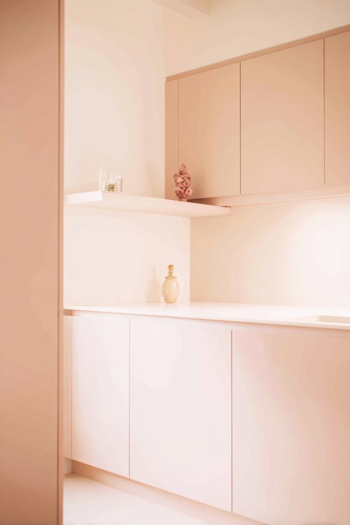 Paint cabinetry or walls in blush pink with matte or satin finishes. Use white for countertops and backsplash—quartz or marble for a luxurious touch. Choose hardware in rose gold or brushed nickel for a subtle gleam. Incorporate layered lighting, including under-cabinet LEDs, to brighten the space. Keep flooring neutral—light wood, tiles, or laminate work well.
