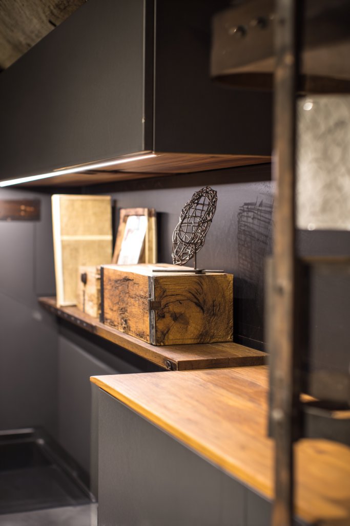Visualize charcoal walls or cabinetry contrasted with warm, textured wood countertops or open shelving. Matte finishes on the charcoal surfaces add depth, while reclaimed or distressed wood introduces warmth. Exposed hardware or pipe fixtures in matte black or brushed metals reinforce the industrial aesthetic. Dim lighting with warm bulbs completes the look.
