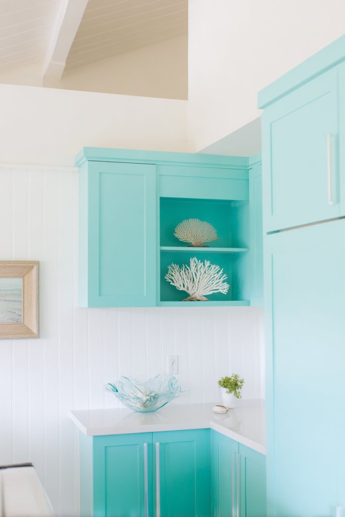 Imagine vibrant aqua cabinets or walls contrasted with crisp white countertops and trim. Glossy finishes on aqua surfaces reflect sunlight, amplifying the bright, airy feel. Incorporate nautical-inspired details like striped textiles or shell accents—without going overboard. Natural light floods the space, making the colors pop.