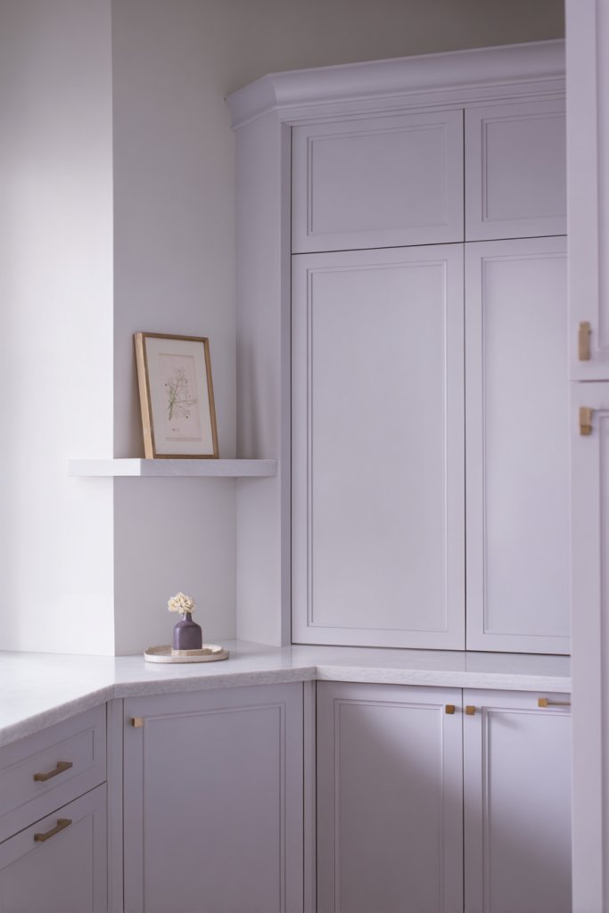 Paint cabinets or walls in light lavender, considering durable, low-gloss finishes. Pair with light gray quartz or marble countertops and sleek hardware. Incorporate layered lighting—pendants, under-cabinet LEDs—to make the colors stand out. Use neutral, soft-toned flooring like pale wood or stone to complete the look. Keep clutter minimal for a polished feel.