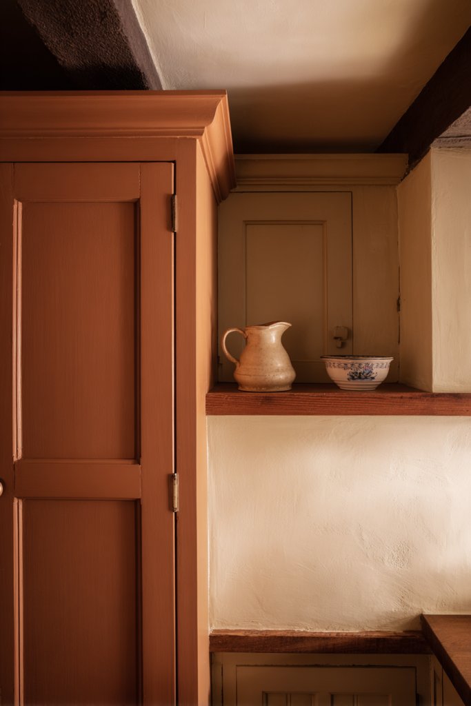 Visualize cinnamon-colored cabinetry or backsplash paired with creamy walls and countertops. Worn wood finishes or distressed textures amplify the rustic charm. Soft lighting in warm tones highlights the richness of the colors, while textured textiles or woven baskets add tactile interest. The overall vibe is cozy, charming, and welcoming.