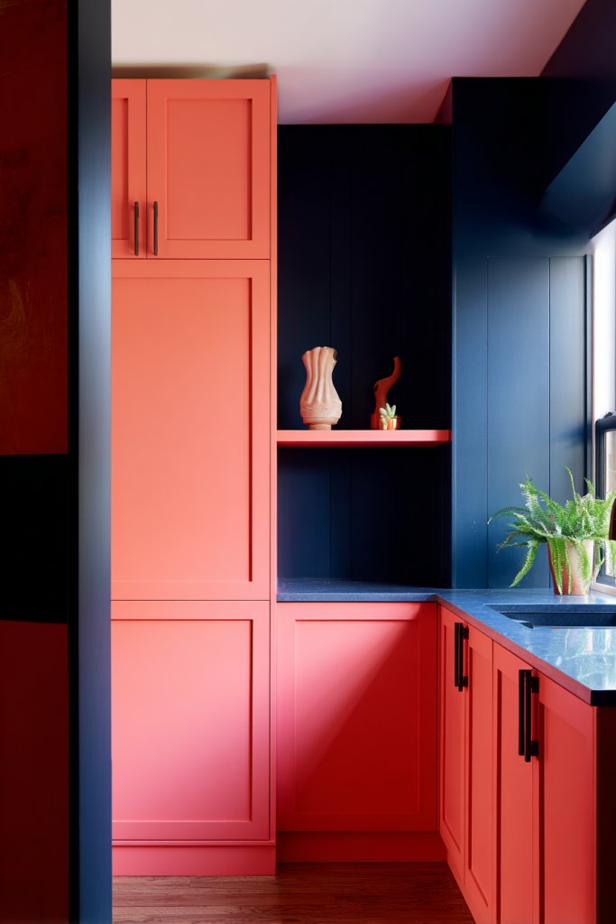 Looking to inject energy and personality into your kitchen? Bright coral paired with navy offers a vibrant, sophisticated aesthetic that’s impossible to ignore. It’s perfect for those who want their space to stand out and feel lively. Ready to make a bold statement?