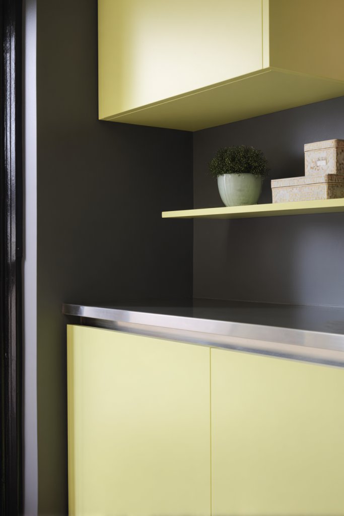 Paint cabinets or walls in pale yellow, choosing durable, low-gloss or matte finishes. Use charcoal gray for countertops and hardware—quartz or laminate. Incorporate layered lighting—pendants, under-cabinet LEDs—to make the contrast pop. Use neutral flooring—light wood or stone—to keep the space balanced. Keep the decor minimal and modern.