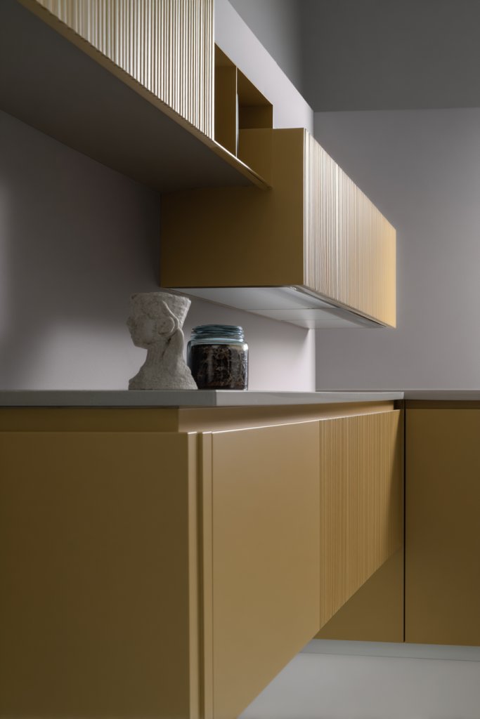 Paint or laminate cabinets in muted mustard, choosing durable finishes—matte or satin. Pair with pale gray countertops and simple hardware in gold or black. Incorporate layered lighting and subtle decorative elements like patterned tiles or textiles. Use neutral flooring—light wood or stone—for a balanced look. Keep clutter minimal.