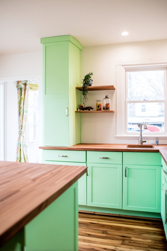 Choose mint green paint or laminate for cabinetry, opting for matte or satin finishes. Pair with solid wood countertops, preferably with visible grain for authenticity. Install open shelves in matching or contrasting wood to display functional items or decorative pieces. Use warm white or soft yellow lighting to enhance the natural feel. Keep flooring neutral—light hardwood or stone completes the look.