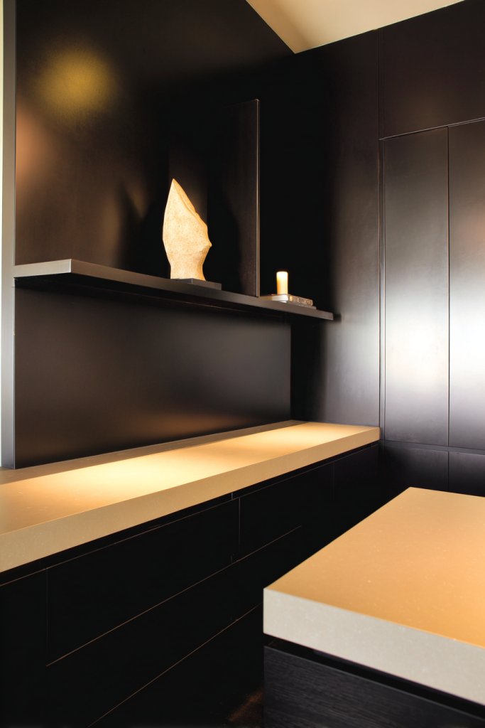 Imagine soft yellow walls or cabinets contrasted with dark charcoal countertops or accents. The subtle yellow adds warmth and optimism, while the charcoal grounds the space with depth. Matte finishes on both surfaces create a modern, understated elegance. Layered lighting enhances the contrast and highlights textures.