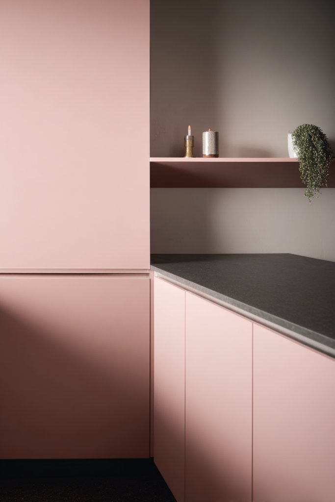 Imagine blush pink cabinets or walls contrasted with dark gray countertops and fixtures. Matte finishes on blush surfaces soften the look, while gloss or satin on gray adds depth. Clean lines and simple hardware keep the aesthetic sleek. Soft lighting accentuates the subtle contrast, creating an inviting yet modern environment.