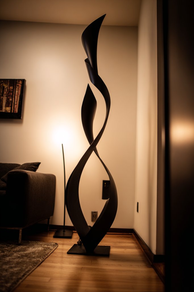Imagine a tall, curvy floor lamp with an abstract metal frame that twists into a unique sculpture. Its warm glow highlights the intricate details, casting playful shadows across the room. The finish might be matte black or brushed gold, adding texture and depth. This piece commands attention without overwhelming the space, blending art and function seamlessly.