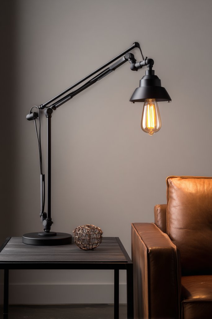 Imagine a sleek, matte black or brushed steel lamp with a swiveling arm and a large, exposed bulb. The metal finish and minimalistic design evoke an industrial workspace, but in a cozy living room, it becomes a statement piece. The directed light highlights artwork, books, or textured walls, adding depth.
