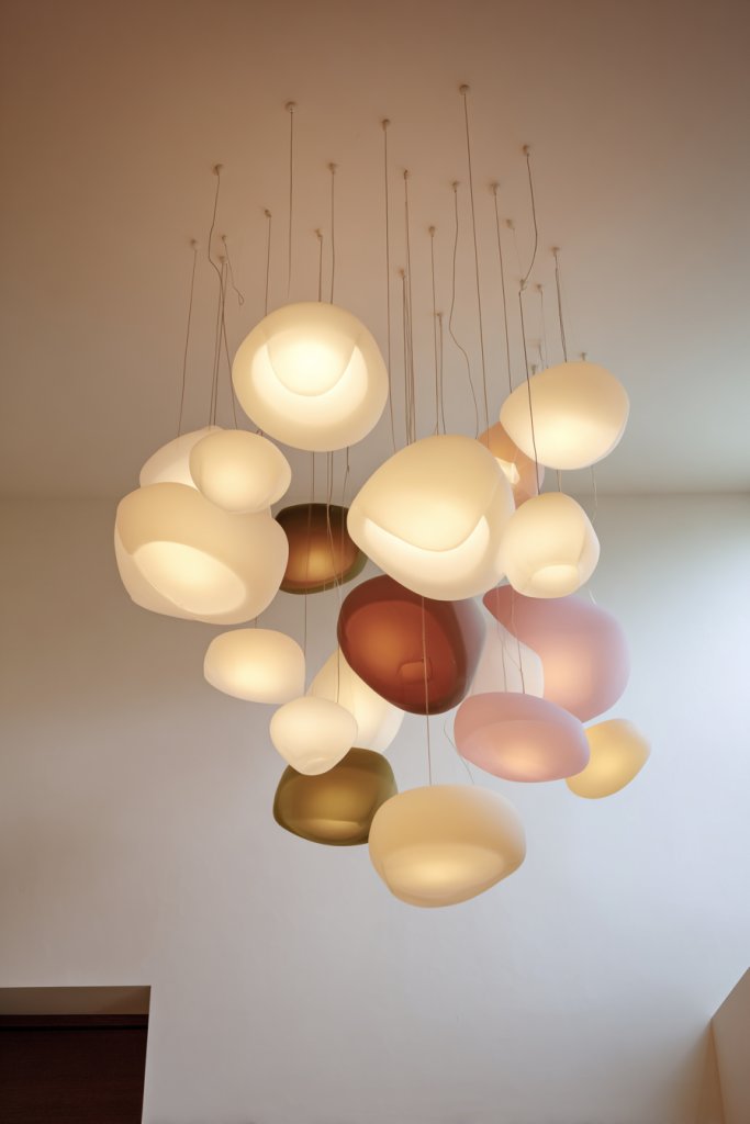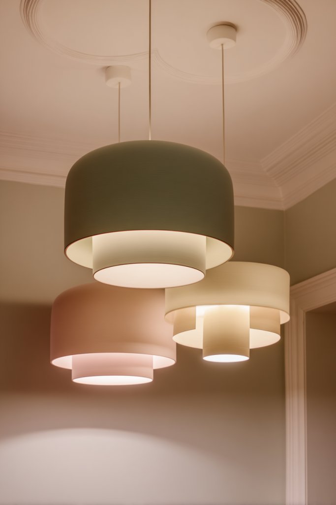 Envision a cluster of three or four pendant fixtures hanging at varying heights, each with a textured matte surface in muted tones like blush, charcoal, or olive. The light filters softly through fabric or glass shades, casting a warm, diffuse glow. The different heights create a dynamic, eye-catching silhouette against the ceiling, adding depth and sophistication.