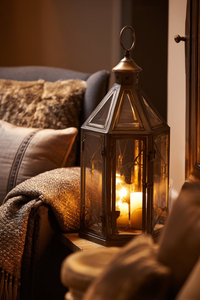Visualize a metal or wood lantern with glass panels, sitting on a side table or hanging from the ceiling. The warm light inside flickers gently through the glass, creating a soft, inviting ambiance. The design’s vintage or industrial details add character, making it a focal point that sparks conversation.