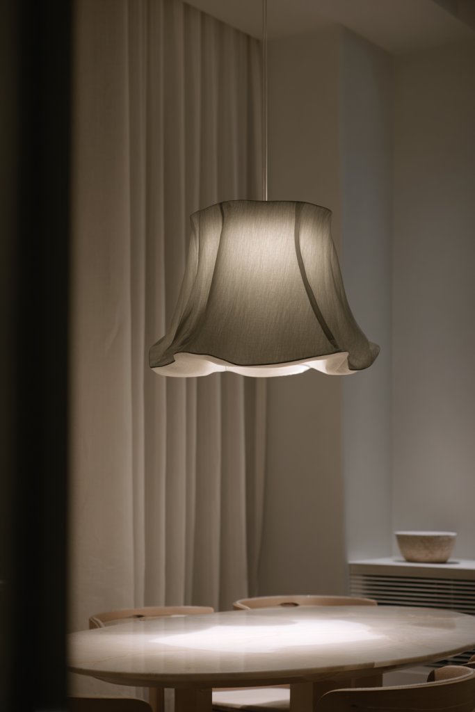 Imagine a series of pendant fixtures hanging at varying heights, each with a textured fabric shade in neutral or pastel tones. The soft light filters through, casting a warm glow that enhances textiles and textured walls. The gentle glow creates an inviting space perfect for relaxing or entertaining.