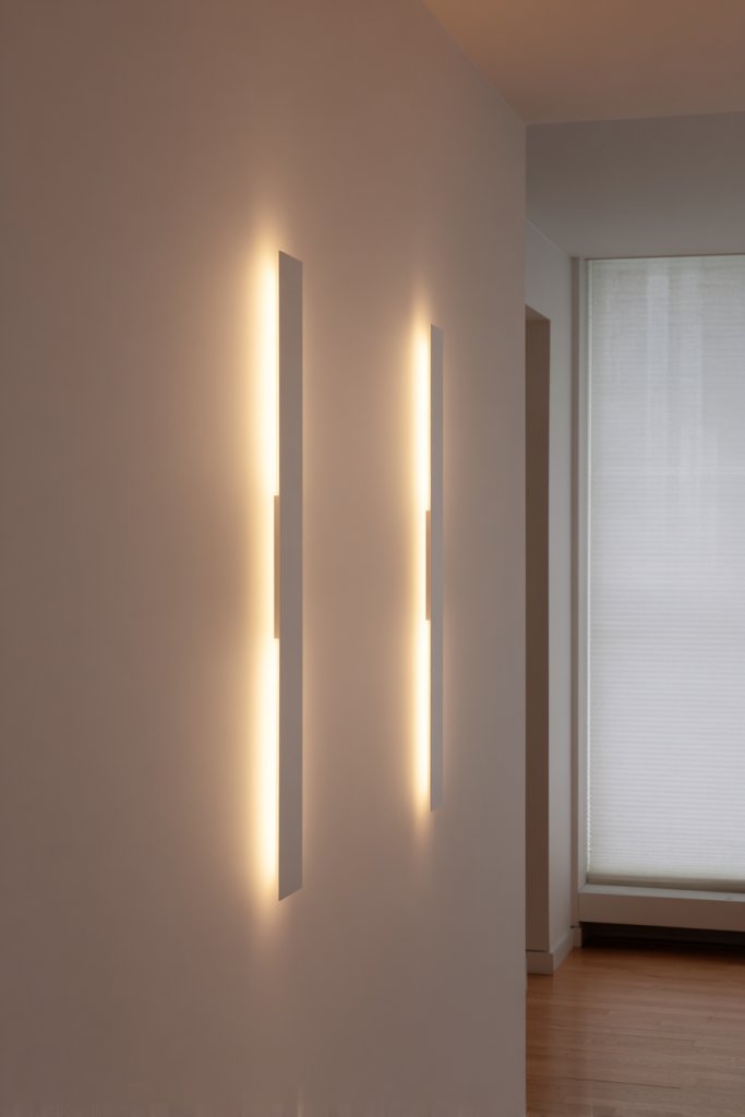Visualize a narrow wall with a set of slim, matte black sconces mounted just above eye level. Their soft, diffused light spills gently across the wall, highlighting textured wall finishes or subtle architectural details. The clean lines and unobtrusive design make the room feel airy and uncluttered, while the light creates a cozy glow.