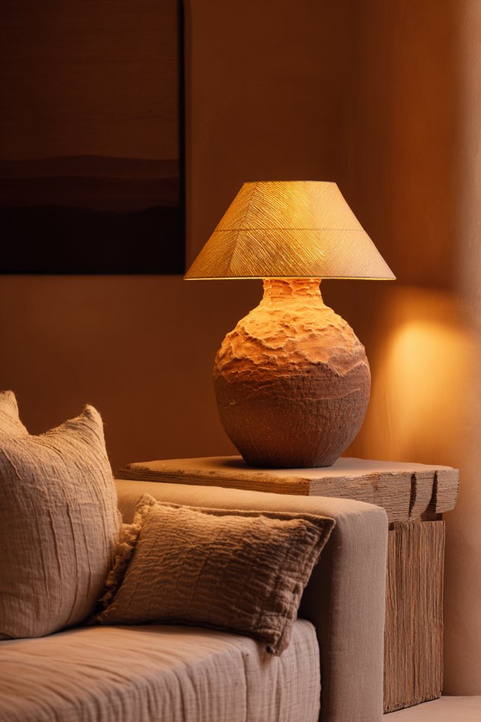 Imagine a sculptural ceramic lamp with a textured surface and organic shape sitting on a side table. The warm glow from a filament or LED bulb highlights the handcrafted details, creating a cozy, artistic atmosphere. The irregular surface and natural colors add depth and character.