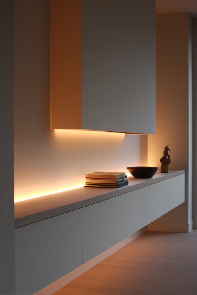 Picture a floating shelf with a continuous strip of LED lighting tucked behind its underside. The soft, diffused light spills downward, illuminating the wall and casting a gentle halo around the shelf. The clean lines and hidden wiring give the room a futuristic yet minimalist vibe, making the space feel open and calm.