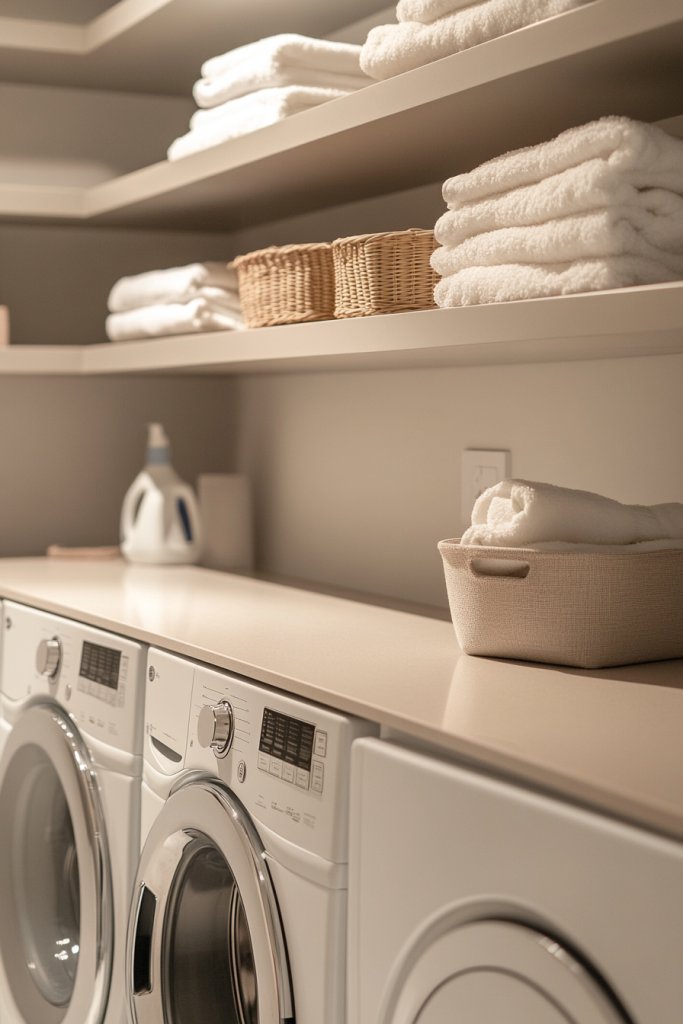 Imagine sleek, sturdy shelves mounted high on the wall, painted in a soft neutral tone to blend seamlessly with your room. Detergent bottles, fabric softeners, and cleaning supplies sit neatly in labeled containers, creating an organized cascade of color and texture. The shelves are minimalist yet functional, with a few decorative baskets adding a touch of charm. It’s a space where everything looks purposeful and inviting, not chaotic.