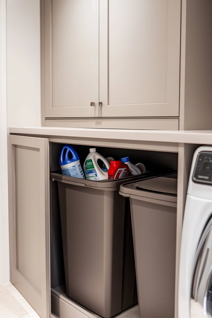 Envision a custom cabinet with integrated pull-out trash and recycling bins hidden behind cabinet doors. When needed, you slide out the bins, dispose of waste, and slide them back in. The cabinetry can be finished to match your laundry room decor, with handles that blend seamlessly. It’s an elegant way to manage waste without sacrificing style.