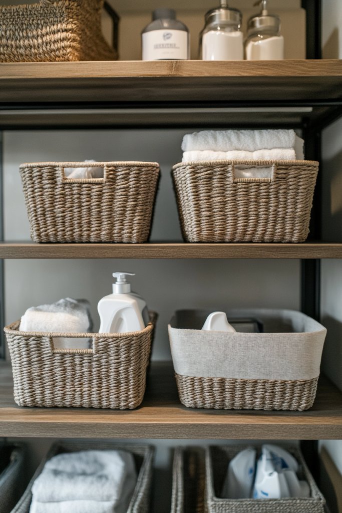 Imagine open wooden or metal shelves mounted on the wall, with woven or fabric baskets neatly arranged. Each basket holds different items like detergents, stain removers, or small tools, with labels for easy identification. The natural textures and organized layout create a warm, inviting vibe that encourages tidiness. It’s a space that looks curated, not cluttered.
