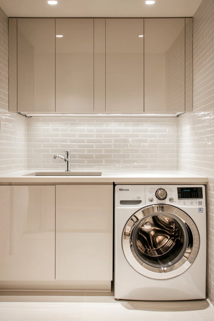 Imagine a sleek, tile backsplash in a herringbone pattern or subway style, running behind your washer and dryer. The glossy surface reflects light, brightening the room and creating a modern aesthetic. The tiles are easy to wipe clean, and their texture adds depth. Complement the backsplash with matching grout or contrasting accents for visual interest. It’s an instant upgrade that feels polished.