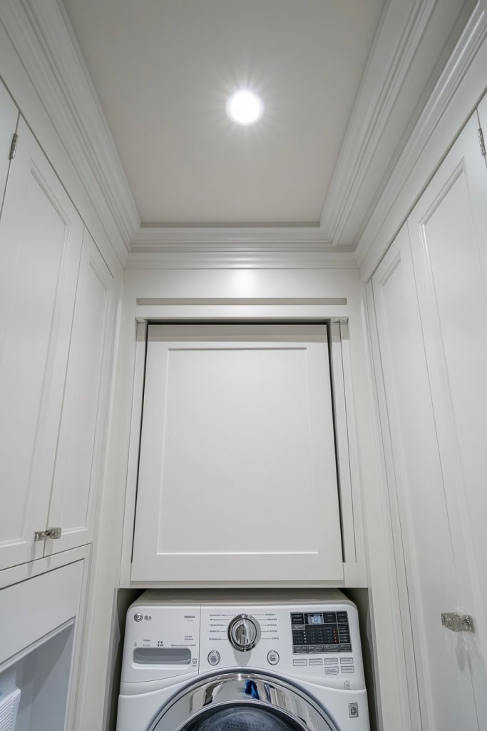 Cluttered laundry rooms often suffer from hidden chaos—small items and seldom-used supplies that clutter your space. Drop-down ceiling compartments hide these items out of sight, maintaining a clean look while offering extra storage. It’s a clever way to keep your space tidy without sacrificing accessibility. Who says storage can’t be sneaky?