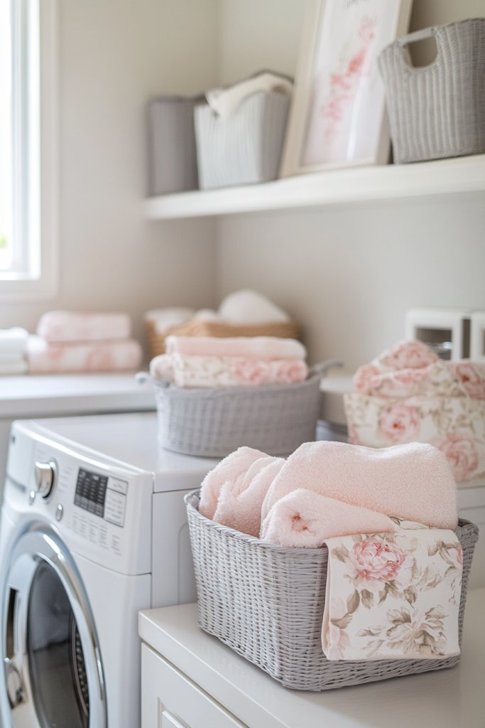 Picture a room painted in soft, soothing tones—perhaps pastel blues or gentle greys—with matching storage bins, towels, and even decorative textiles. The entire space feels harmonious, with every element complementing each other. Subtle accents like colored hooks, baskets, or mats tie everything together, creating a unified look. It’s a space that invites you to relax rather than dread.