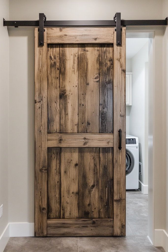 Picture a weathered wooden barn door sliding smoothly on black metal rails, contrasting beautifully against crisp painted walls. When closed, it creates a sleek, seamless look that hides your laundry chaos behind. When opened, it reveals a bright, inviting space with subtle textures—like a reclaimed wood finish or matte black hardware—that adds depth and character. It’s a statement piece that elevates the entire room.
