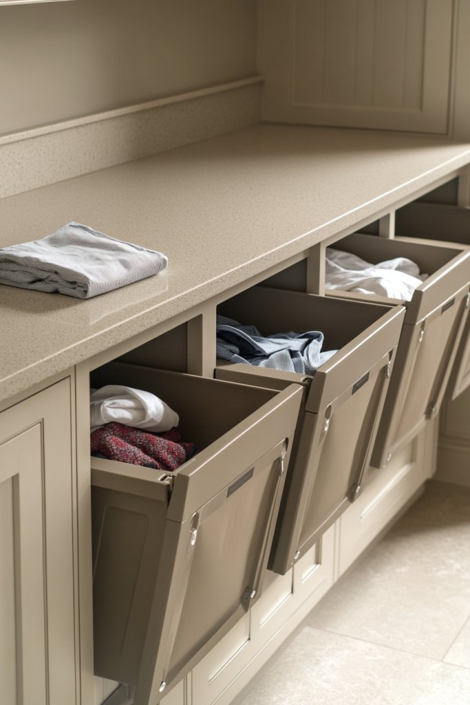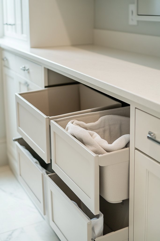 Envision a built-in cabinet with multiple pull-out bins, each labeled for whites, colors, or delicates. When you need to sort, you simply slide out the bins, quickly toss in clothes, and push them back in. The bins are often made of durable fabric or plastic, with sleek handles for easy access. The cabinet blends seamlessly into your laundry room, maintaining a clean, minimalist vibe.