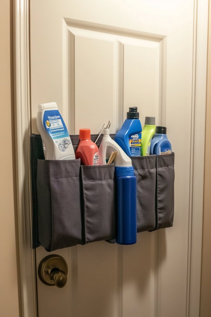 Choose from mesh, canvas, or waterproof vinyl pockets depending on your style and moisture exposure. For a more streamlined look, select slim-line pockets that hang flat against the door. Add labels or color-coded pockets for easy identification. This idea adapts well to various door types—standard, sliding, or even closet doors—making it highly versatile.