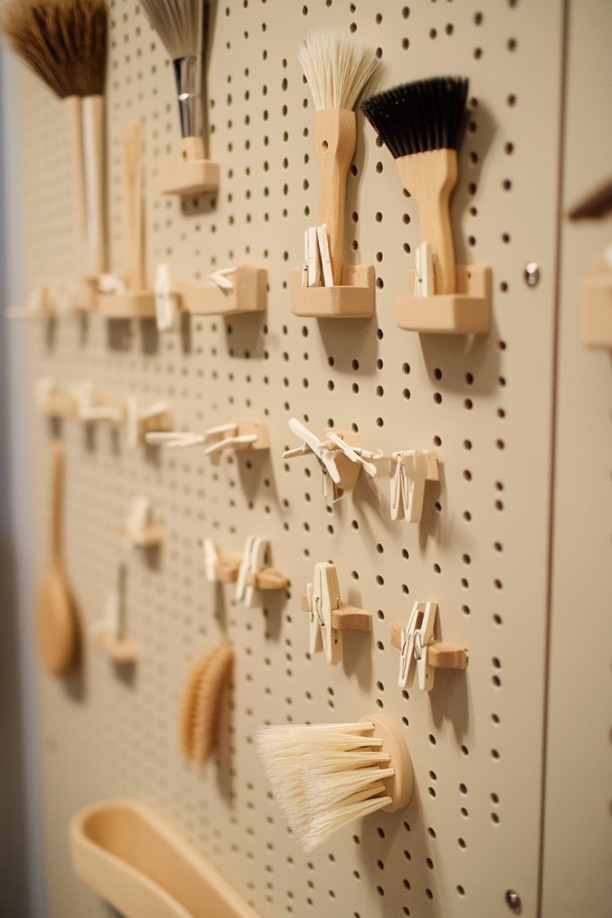 Imagine a vibrant pegboard mounted on the wall, filled with hooks and small shelves. Brushes, clothespins, and small containers hang neatly, each designated for a specific tool. The board can be painted in a fun color or left in a natural wood finish to match your style. It creates an eye-catching focal point that’s both practical and decorative.