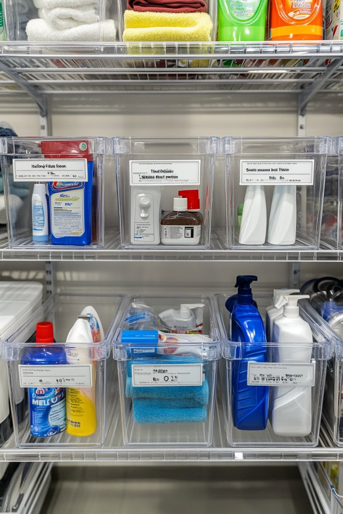 Imagine a set of sleek, transparent bins neatly arranged on shelves or countertops. Inside, detergents, fabric softeners, and stain removers sit in organized stacks, with labels clearly visible. The clear plastic adds a modern, minimalist touch and makes it easy to spot when supplies are running low. The uniform look creates a calming, clutter-free environment.