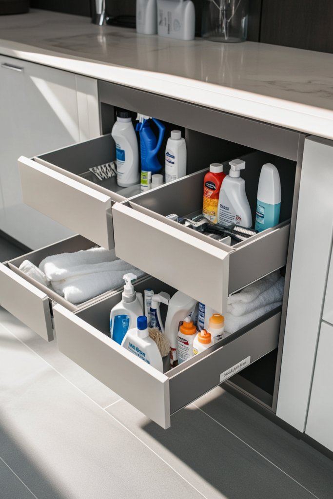 Visualize sleek, metal or wooden drawers neatly tucked beneath your sink or countertop. When you need supplies, you pull out the drawer with ease, revealing labeled containers and neatly arranged tools. The drawers glide smoothly on sturdy tracks, and their clean design blends seamlessly into your cabinetry. It’s a hidden storage solution that feels both modern and practical.